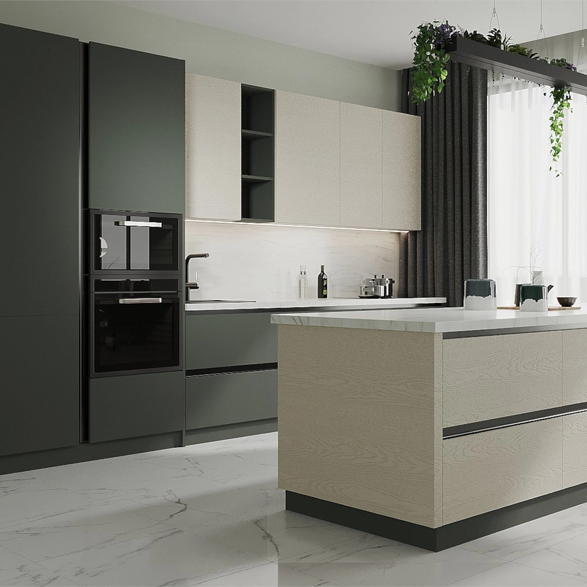 Выразительная пластика фасадов. Волнообразная фрезеровка на лицевой части создаёт игру света и тени, добавляет динамики и делает лаконичные формы более живыми, поддерживая современный, стильный образ интерьера.
