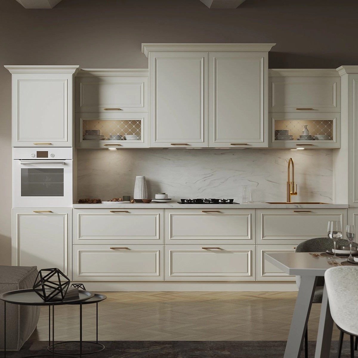Современное прочтение классики: изысканные фасады с утонченной фрезеровкой, продуманная эргономика и технологичный комфорт. Подходит для неоклассики, классических интерьеров и ар-деко